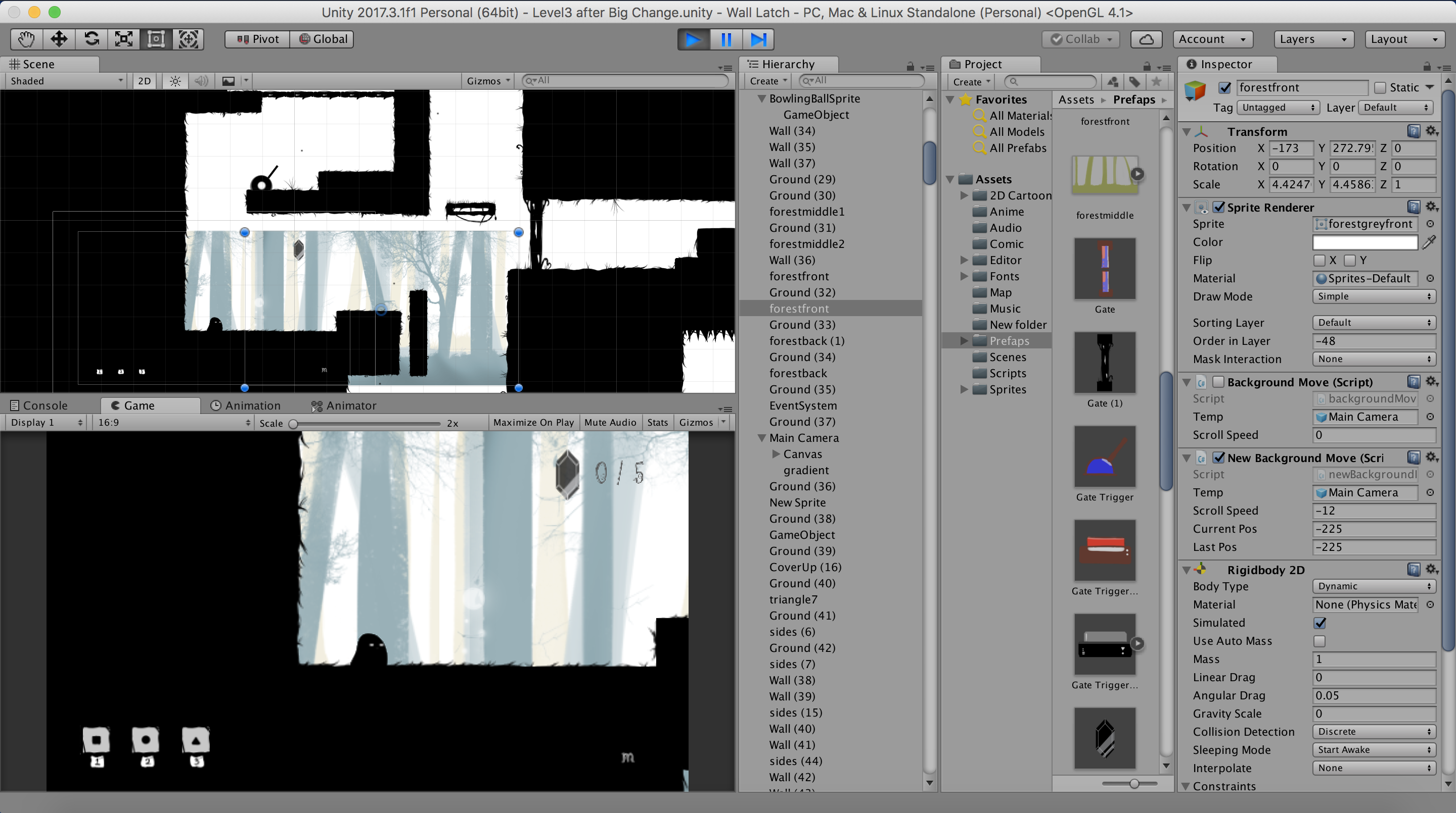 I have encountered numerous problem with the character transformation regarding each shape transforms’ unique properties. The blocky style provide the player immune to crushes, and allow them to slam down on top of enemies to defeat them. Whereas the spiky style allow user to stay still and defeat enemies dropping down onto your sharp spike top. The main problem is associated with the ball form, which is supposed to allow users to roll and move much faster while having a lighter and smaller body to pass through tight tunnels. In order to provide the feel of smooth rolling, I had to temporarily switch the method of moving the character across the along the map to a different one. I switched from using x = x+1 to unity rigidbody.addForce. One is constant velocity change while the other allow dynamic speed ramp. Addforce also provide free form rotation for the ball rolling effects which I did not expect. Solving this problem resulted in smooth and rewarding experience, playtesters are all hooked on the ball form and consider it a pleasant form that they wish to be able to transform to infinitely.