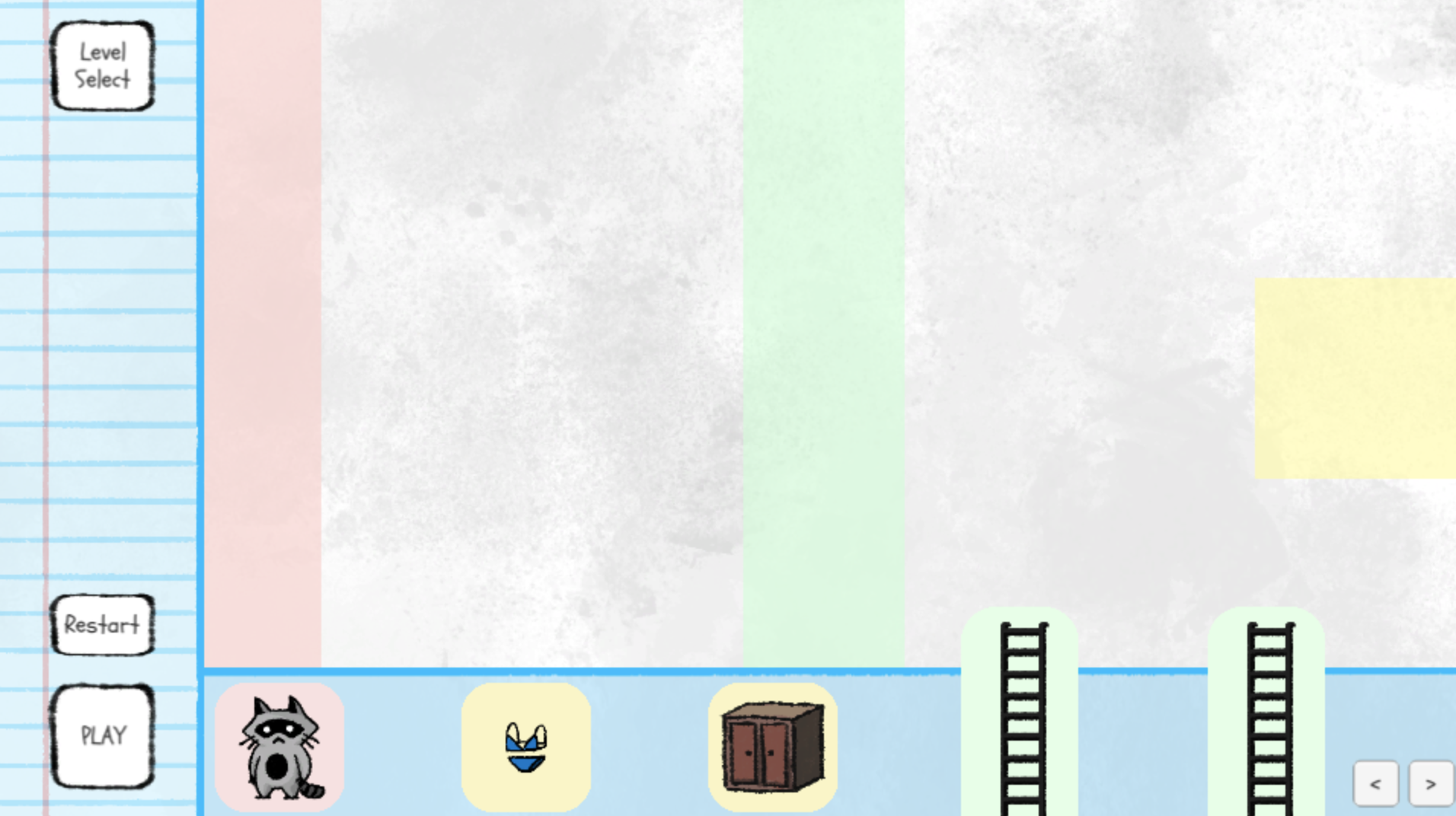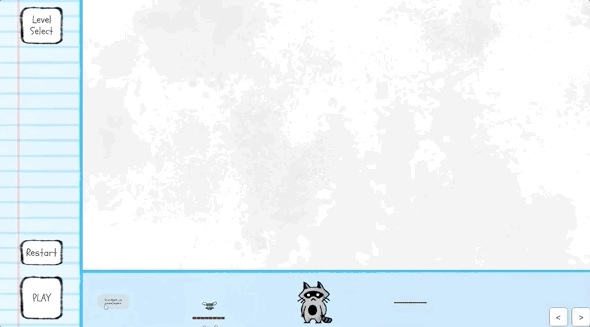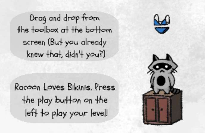 An inventory of objects is provided to players including platforms, bikinis and the racoon. Players are able to drag the objects onto the play area to composite the level. Player can play and test out their composition anytime and retry